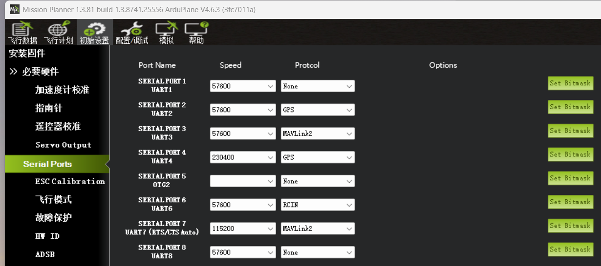 arduplane固件设置参考:Mission Planner地面站软件 → 初始设置 → Serial Ports