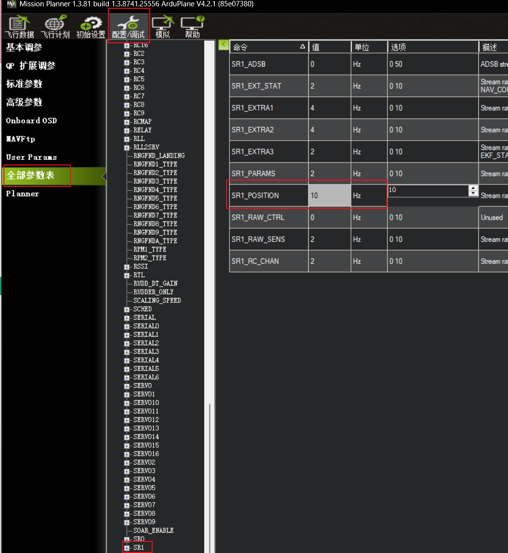 配置/调试 → 全部参数表 → SR1 → SR1_POSITION → 10HZ