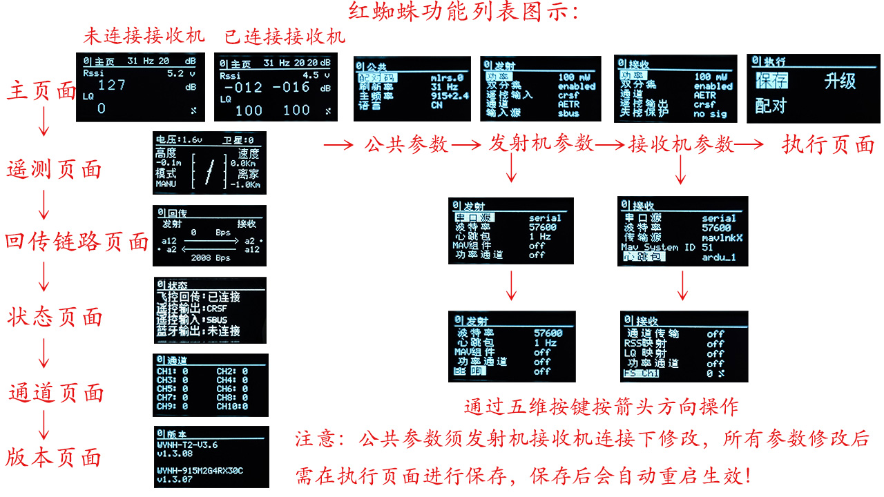 目录 搜索 展开 红蜘蛛高频头简介使用手册和教程发射机使用手册接收机使用手册天线安装方法地面站连接方法进阶功能设置手册功能列表参数介绍参数修改小蜜蜂AAT连接接收机配对SBUS(转发)RSSI(LQ)设置常见问题处理无数传回传无遥控数据蓝牙不能获取全部参数 暂无相关搜索结果! 功能列表 列表介绍: 首先认识红蜘蛛OLED屏幕的各项参数页面,通过五维按键方向操作 公共参数页面需要高频头和接收机连接中进行修改,否者可能出现高频头和接收机无法通信的后果!Mlrs系统的说有参数修改后需要再执行页面惊进行保存,保存后会自动重启!作者:admin 创建时间:2026-01-31 10:46最后编辑:admin 更新时间:2026-02-04 11:04 提交评论