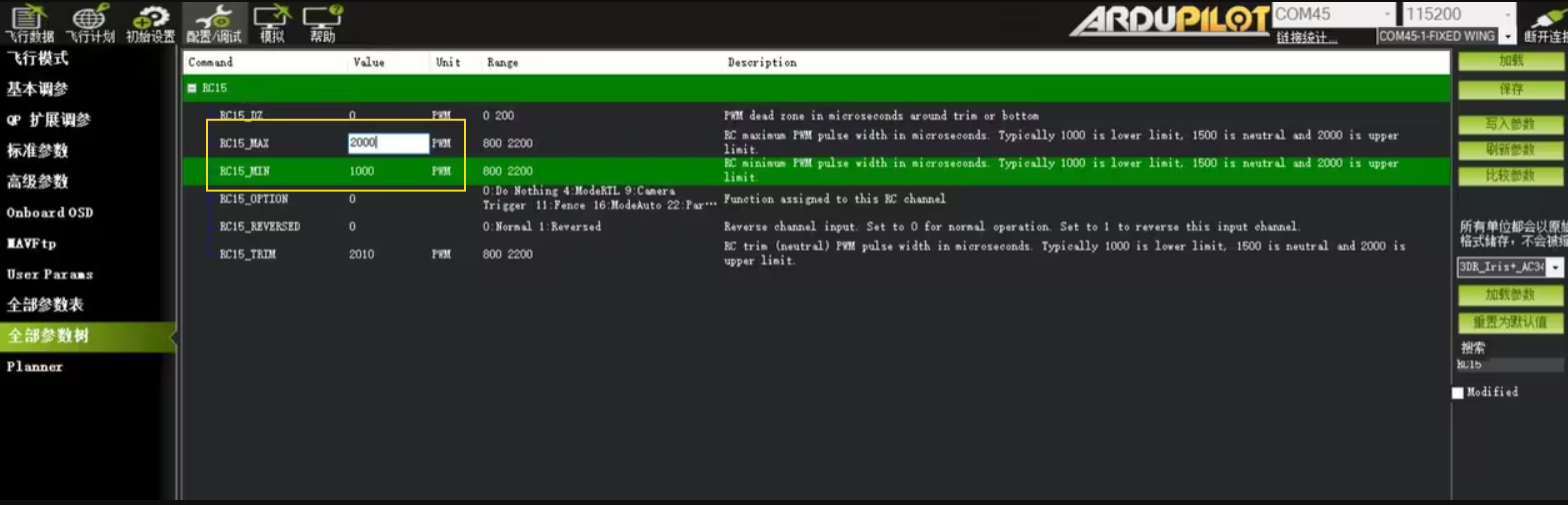 修改 RC15_MAX 2000 RC15_MIN 1000