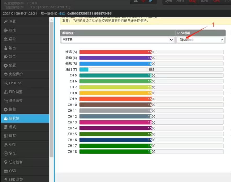 INAV固件再接收机页面启用,并设置读取通道,保存重启飞控生效