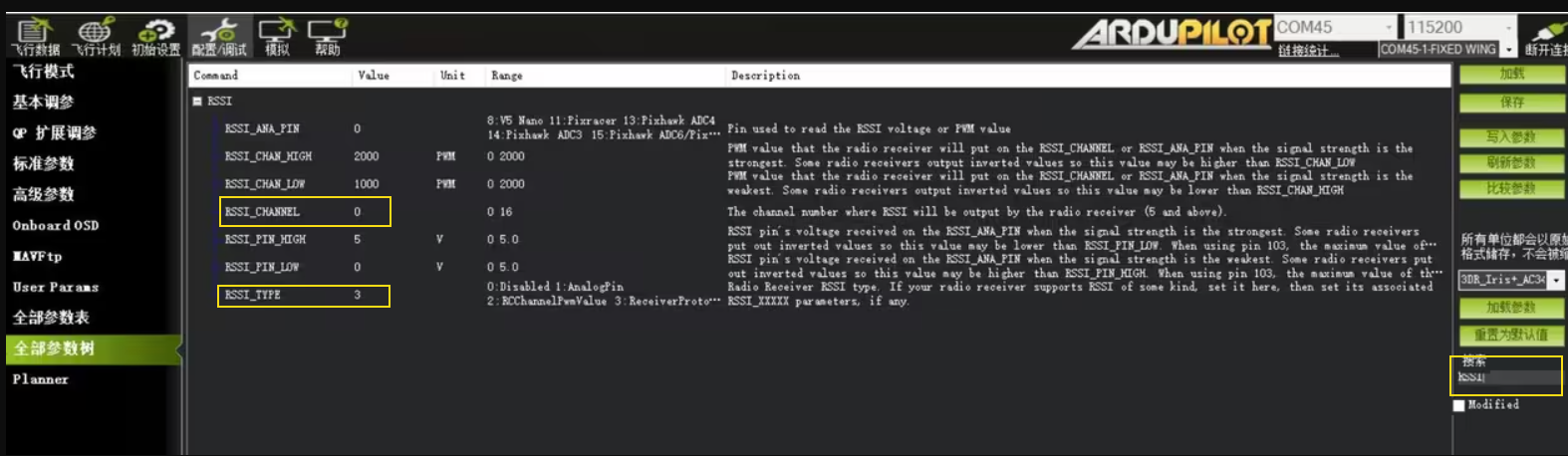 AP固件:Misson Planner地面站:配置/调试 → 全部参数树 → 右边搜索“RSSI”